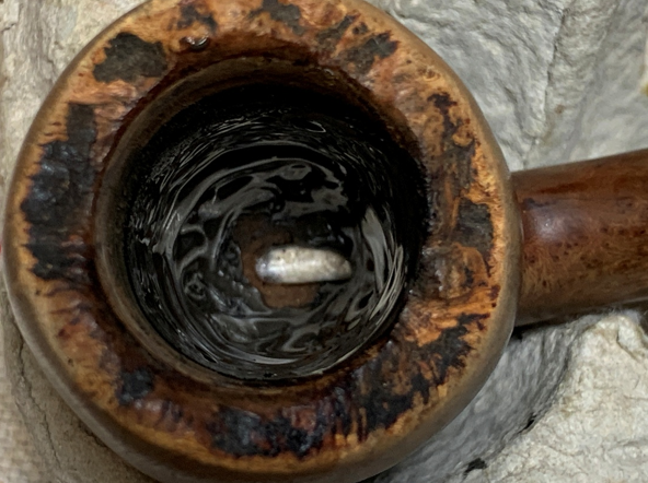 One more mini project is needed before we’re finished. The repair that was done to the chamber is in good shape. What I like to do when chamber repairs have been done is to apply to the chamber a ‘pre-cake’ to help create a protective cake that will protect the chamber walls from heating. There’re a few ways to do this using plain yogurt or sour cream with activated charcoal or applying ‘pipe mud’. Since I’m out of sour cream and yogurt, pipe mud is the approach with this Ben Wade. Pipe mud is created from premium, sifted and clean cigar ash. I say ‘premium’ because it takes a lot of cigars to make cigar ash. These ashes come from Cuban cigars smoked by me and fellow colleagues in Krakow, Poland in March and April 2022. We were there helping with Ukrainian refugees because of the Russian invasion and one of the things we did for a special evening together was to go to a local cigar parlor in the city center. So, this ash is valuable ash 😊.