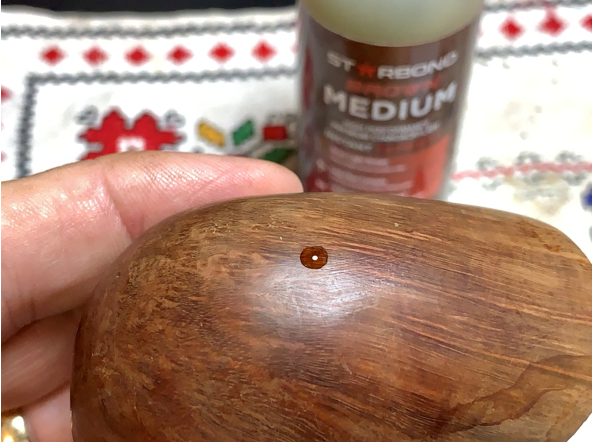 Brown Medium CA glue is used placing a drop on the pit from the end of a toothpick. Allowing a drop of CA glue to form on the end of the toothpick gives more control over how much CA glue is used and how to place it.