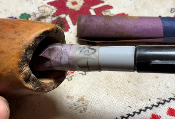 Using the pipe nail tool, the mud is spread over the chamber wall. You can see a pipe cleaner guarding the draft hole from being blocked by the mud. The picture below shows the mud looking good. It will cure fully in an hour or so. A word to the new steward of this Ben Wade Deluxe: When the pipe is put into service, do not scrape the chamber with a metal tool! This will remove our valuable Cuban ash. Rather, use a folded pipe cleaner and gently rub the sides of the chamber to remove the debris. Continue to do this for several smokes and a nice protective cake will develop. Cakes do not need to be thicker than a US dime.
