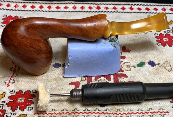 Next, Blue Diamond compound is applied to the stem and stummel, avoiding the plateaus. With a dedicated cotton cloth buffing wheel mounted on the rotary tool with the speed set at about 40% full power, the compound is applied. Most people think that the wax phase is where the shine happens, but the phase of applying the fine abrasive compound is where the natural shine is coaxed out.
