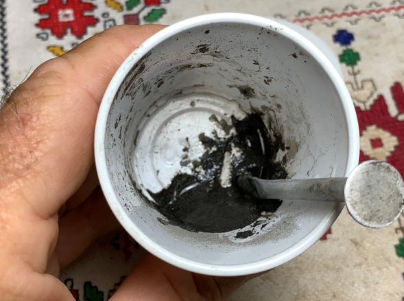 The key is to use as little ash as possible to do the job. With the ash in the cup, a very small amount of water is added and mixed. Too much water usually results in having to add more ash to achieve the right thickness – not too runny but thick enough that it spreads and stays where you put it. I did have to add a small amount of ash to arrive at the viscosity needed.