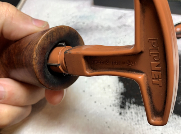 The focus switches to the Lovat Dublinesque stummel by reaming the conical and canted chamber. The reaming starts with the Pipnet Reaming Kit using 3 of the 4 blades. The larger third blade was only used for about ¼ of the way down the chamber when I became concerned that the blade might start gouging the briar because of the angle of the slope.