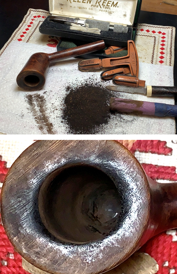 The full arsenal of tools is shown along with the pile of carbon removed. The chamber is inspected and what I see is healthy briar – no burning issues in the chamber.