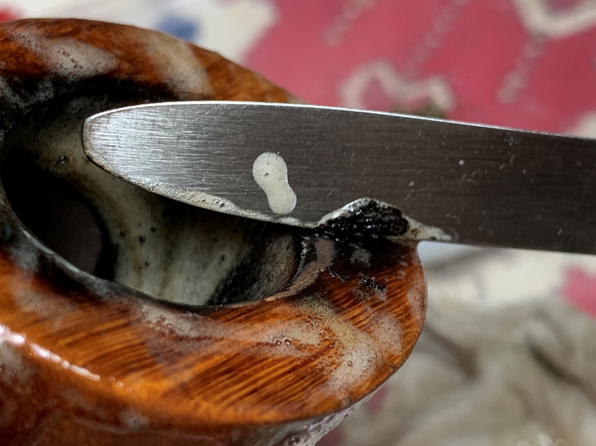 The charring damage is scraped with the edge of the Savinelli Fitsall Tool. All the charred wood needs to be removed to surface the healthier briar.
