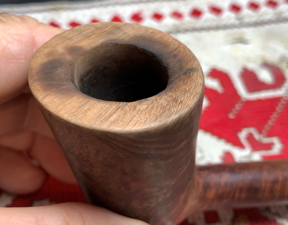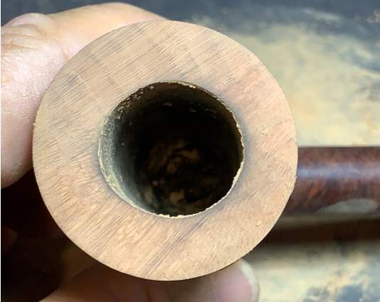 The burning has already caused deterioration of the briar. The lines try to show how the rim is sloping downwardly instead of being a flat plateau. The dots show where the inner edge of the rim should be. It will take topping the bowl to remedy this and there’s no way of knowing how far the briar could be darkened by the charring. The good news is that the finish is dark and that should help to mask dark briar if there should be some.