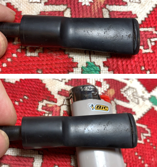 The oxidation removal looks good. There remains the tooth chatter on the bit – upper and lower. The button also had some bite marks. To address this, heating the vulcanite is the first step. When the rubber is heated by painting the bit with the flame of a Bic Lighter, the rubber expands with the heat encouraging the tooth chatter and compressions to regain their original disposition – or closer to it. The before and after pictures show some progress but chatter is still evident, but I don’t believe a patch will be necessary. Straight sanding should erase the blemishes. Upper:
