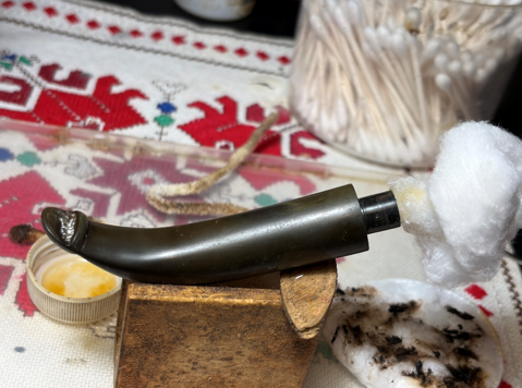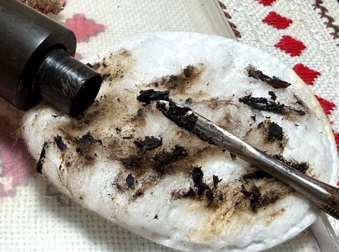 Well, here we go again with another 9mm cleaning effort. Before I get to the pipe cleaners and cotton buds moistened with isopropyl 99% alcohol, the small dental spoon is used to reach deeply into the stem cavity to scrape the sides. The muck was plentiful!