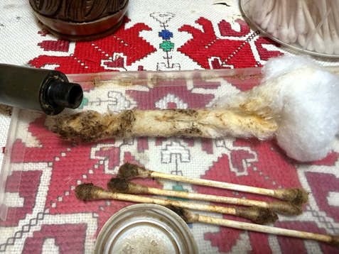 The cleaning of the internals continues using pipe cleaners and cotton buds moistened with isopropyl 99% alcohol. As the photo shows, a good amount of cleaners and buds were used. When they started emerging lighter the cleaning is completed.