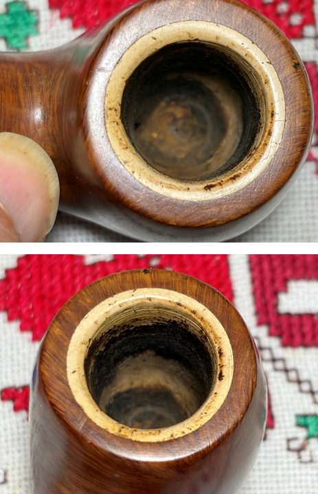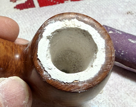 I had read and heard from other pipe restores that an old late 19th-early 20th century druggist recipe for fixing broken meerschaum was egg whites and finely ground chalk, so that was what I was going to try and fix the meer lined rim with. It is said to have about the same porous properties of meerschaum and imparts no taste to the tobacco.