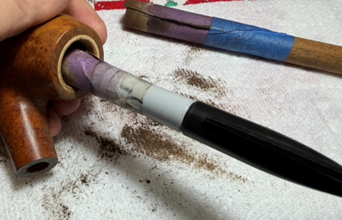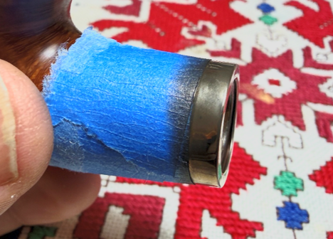 It was helpful for me to write out the issues and thought processes in ‘real time’ and to discover a direction after laying out the facts and concerns. Following the general steps in Troy’s post, the first step is to mask the pipe to protect it from getting a Recipe splash on it. To do this painters tape is used. I leave a small gap of briar exposed on the rim to allow a bit of overlapping over the native Meerschaum. I’ll clean this up after everything is done.
