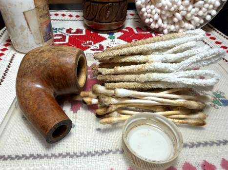 Transitioning now to the stem, it had been soaking through the night in Briarville’s Oxidation Remover. After it was fished out, the inside of the stem was cleaned with a pipe cleaner and cotton bud moistened with isopropyl 99% alcohol. The exterior of the stem was rubbed vigorously with a cloth to remove the oxidation that had been raised through the soak. The soak did a very good job.
