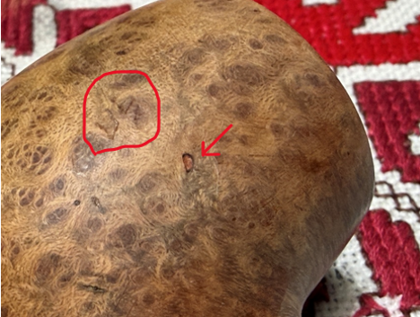 I find one fill that looks like it needs to be repatched. The arrow is pointing this out. The circle is around the ‘runes’ I pointed out earlier – on this side of the bowl and what appears to be a matching impression on the other side. I’ll keep my eye on these during the sanding process to see if that takes care of them.
