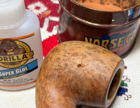 After wiping the area with alcohol to clean, a small drop of CA glue is placed on the pit and then sprinkled with briar dust to give the patch some texture.