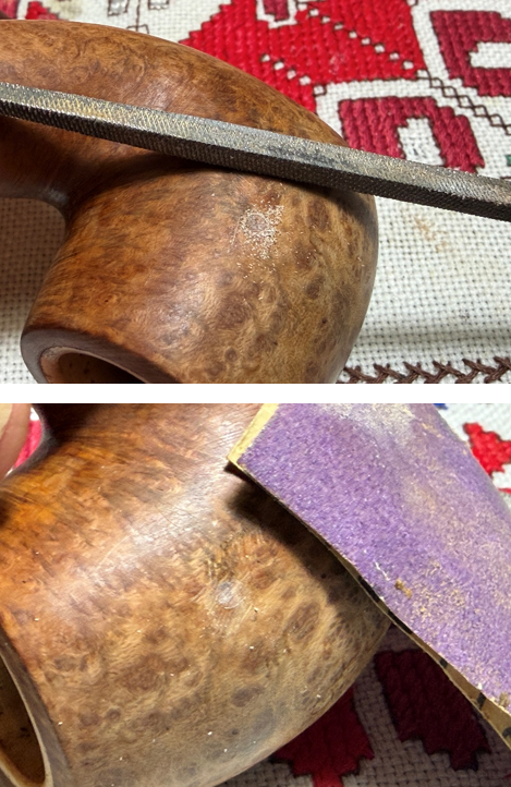 After the patch fully cures, the mound is filed with a needle file flush with the briar surface. Following the filing, the patch is sanded with 220 grit paper, keeping the sanding footprint as small as possible.