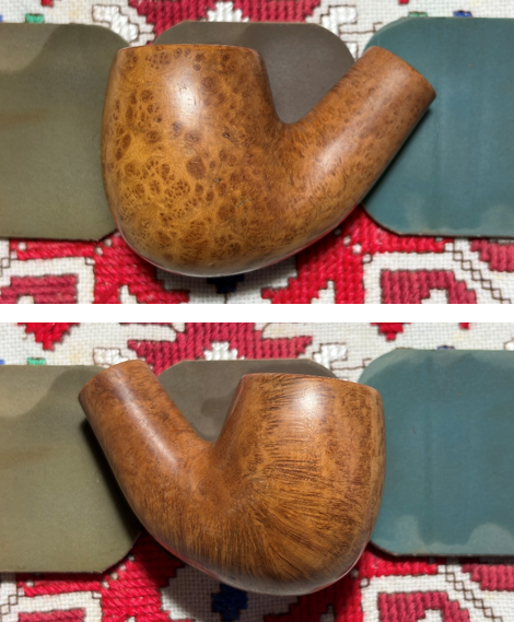 Taking a closer look at the briar surface, I see that most of the old finish has come off. The residual finish is shinier and darker than the bare briar.
