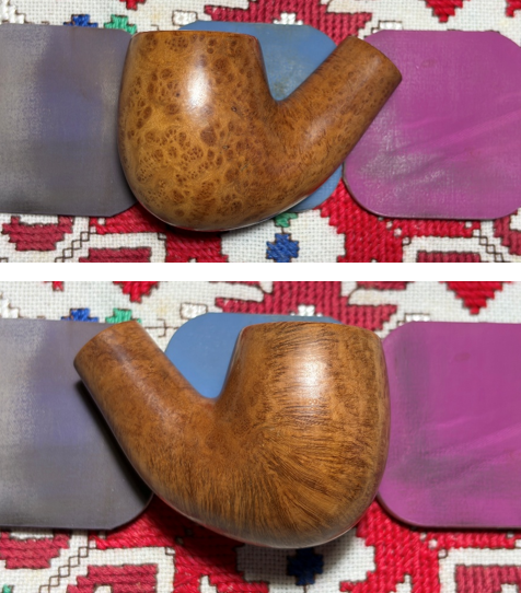 The stummel also has normal pits, dents and scratches of wear. I did find something that I’ve never seen before. Imprinted on both sides of the bowl appears to be a stamp or impression of something…. They are only visible in the light’s reflection. Yet, looking right at them with the eye, they disappear. Perhaps a secret Knights Templar rune?? Have you noticed the amazing grain? The lower picture showcases beautiful bird’s eye and the horizontal flame grain on the first photo – not bad.