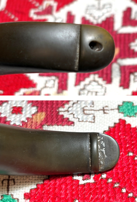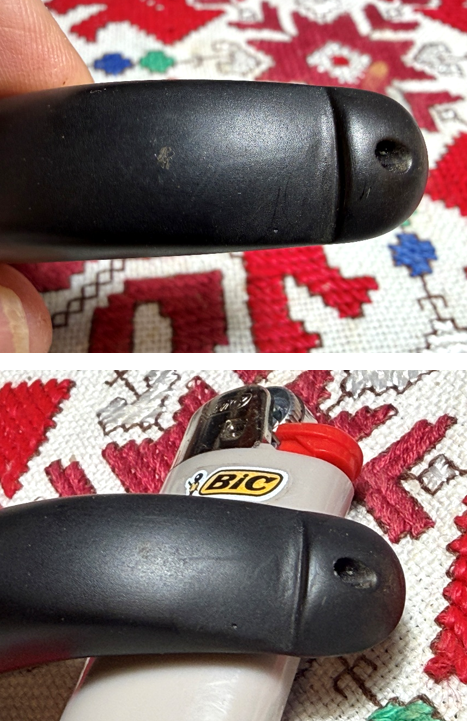 Looking more closely at the upper bit, there is a small bite compression right at the base of the button lip. To help reduce the compression, the heating method is used. The flame of a Bic lighter paints the area moving the flame back and forth – not holding it still in one place which can burn the rubber. As the vulcanite heats, it tends to expand moving back to its original position or closer to it. The before and after picture shows an improvement. Simple sanding should erase the compression.