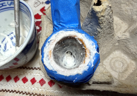 When the mixture seemed about right, a finger is dipped into the Recipe mixture and then applied around the chamber wall and over the rim. I forgot to mention, I had inserted a pipe cleaner through to the draft hole to guard against blockage. This first application needs to set for about 2 hours to dry and harden before I apply another coat.