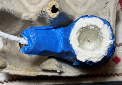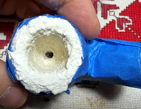 After several hours, the final application of the Old Time Meer-lined Recipe was applied. I added some chalk to the final mixture to thicken it a bit more and applied it around the chamber with my finger. I will let this final application cure through the night to make sure it’s fully dried and hard.
