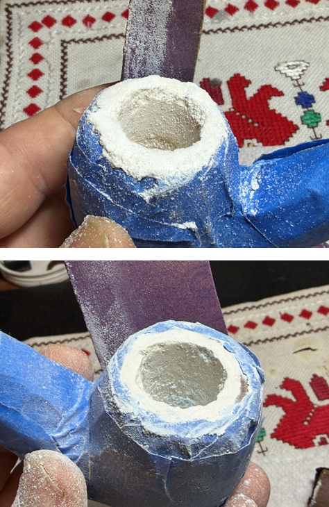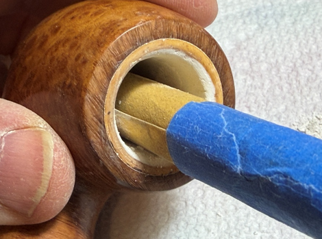 Working with Meerschaum, the motto always is, ‘less is more’. Using 220 grit paper wrapped around a dowel rod and Sharpie Pen, the chamber is lightly sanded.