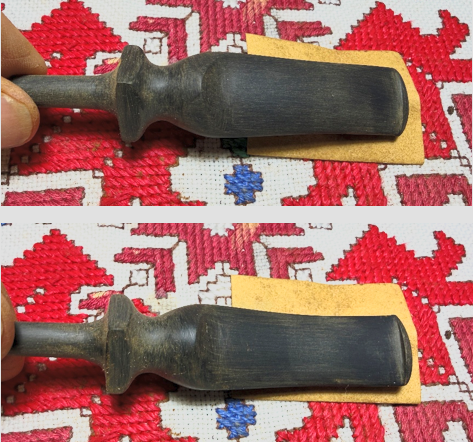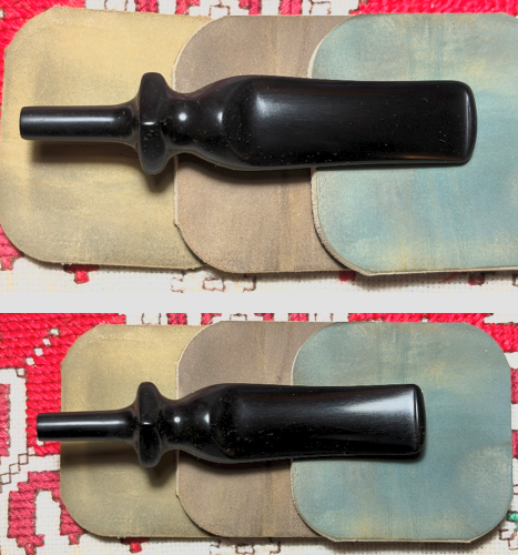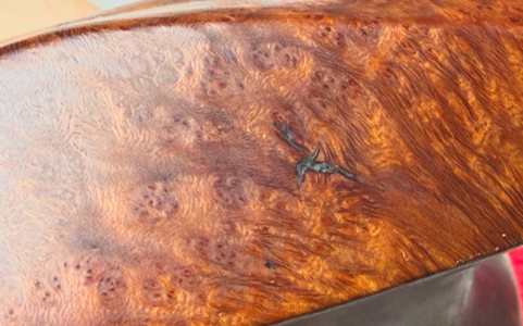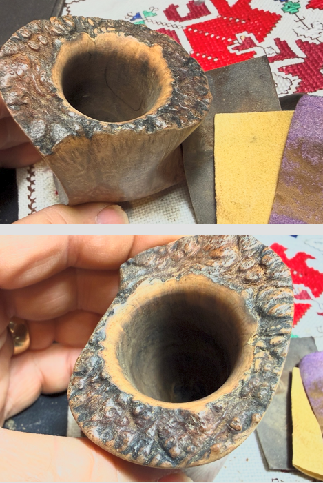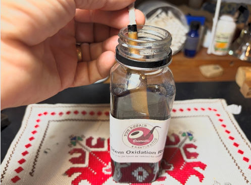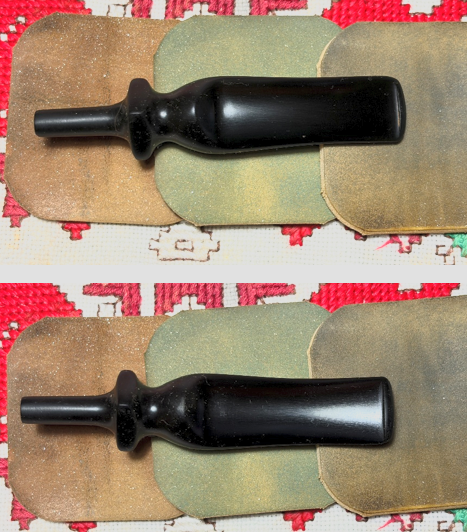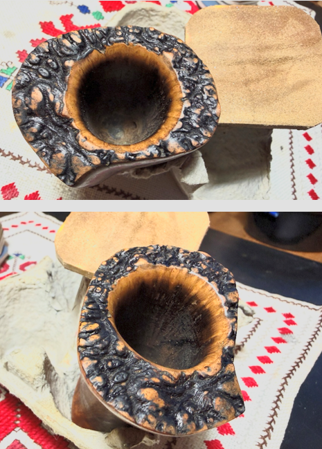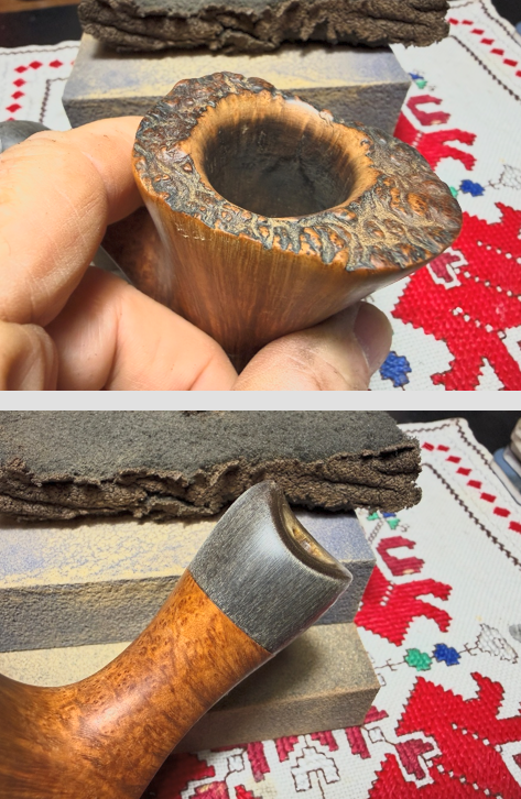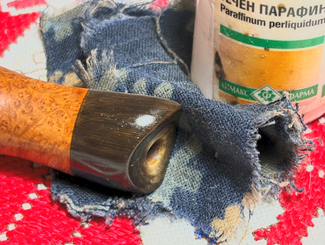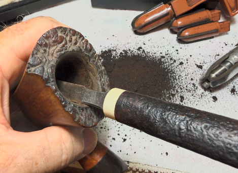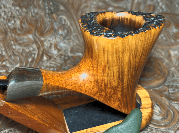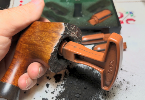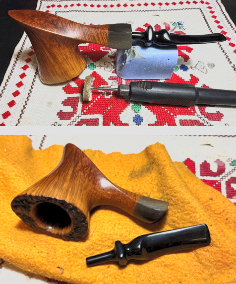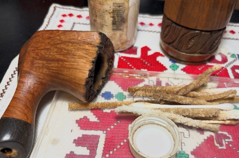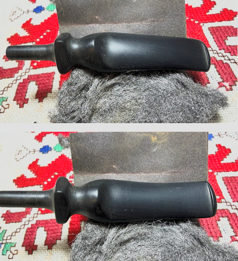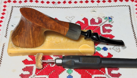 With a continuing appreciation for legacy of Preben Holm, it’s time to look at the issues of this Hand Cut Freehand.  The next two photos show a thick cake in the chamber as well as a dirty plateau.The only blemish I see on the Freehand stummel is on the lower panel.  It appears to be a natural imperfection in the grain.  It looks like Preben Holm gave this blemish a pass and I will do the same.The oxidation is as about as thick as you can get on the vulcanite fancy stem.  The deep olive green needs to be removed and glossy black taking its place.  The upper bit has some bite marks and some tooth chatter.  The button shows a divot as well.  The lower bit looks pretty good.To begin the cleaning process, one pipe cleaner shows that the fancy stem’s airway is clean.The oxidation is attacked using Briarville’s Pipe Stem Oxidation Remover which usually does a pretty good job.  The stem will soak for several hours.Moving now to the stummel, the first step is to clean the chamber.  The carbon cake is thick, and it needs to be removed to start a fresh cake and to inspect the chamber wall to see if there are any heating issues. A fresh photo represents the starting point to mark the progress.With the size (depth 1 7/8 inches) and angle of the chamber only the 2nd and 3rd of the Pipnet Reaming Kit blades helped at all.  They were too small for the chamber, but I did use them to scrape the sides by angling them.The Kleen Reem Pipe Tool went to work next.  I found this great tool a number of years ago at a Flea Market somewhere in Kentucky on one of our road trips. The Tool has expanding blade arms as the knob on the end is turned.  It was able to help a bit more clear cake.The Savinelli Fitsall Tool worked well scraping the walls and also removing lava flow from the inner ‘crater’ ring at the top of the chamber.Following the scraping, the chamber was sanded with 220 sanding paper wrapped around the dowel.  It also sanded the ‘crater ring’ more.A good pile of carbon cake was liberated from the huge chamber which will pack a lot of blend!  All the tools doing the job are shown.An inspection of the chamber reveals healthy briar.One of the fringe benefits of most Freehands is the extra briar real estate that can be sanded and polished.  The ‘crater ring’ was created by the Preben Holm shop in Copenhagen with a slight canted outward angle that will finish very nicely.  I love the contrasting created by smooth briar and the rough plateau – the outer skin or bark of the burl from which this choice block of briar was harvested.Next, the cleaning continues with the exterior briar with undiluted Murphy Oil Soap using a cotton pad to do the scrubbing.  A toothbrush is used to scrub the plateau.  The surface was pretty grimy.The pipe is taken to the sink where the internals are scrubbed with shank brushes and anti-oil liquid dishwashing soap.  My choice of soap is Dawn.  After the scrubbing, the stummel is rinsed thoroughly and returned to the worktable.The cleaning continues with the internals using cotton buds and pipe cleaners.  It didn’t take to long for the pipe cleaners to and buds to emerge lighter and it was time to move on.Taking a closer look at the stummel, I can’t get over the straight grain.  It’s a beautiful block of briar.  The only issues other than sanding the briar is to refresh the plateau and to sand the crater ring.The acrylic shank expansion needs sanding…. Wait a minute.  After the cleaning, I take a closer look at what I thought was black acrylic now looks like horn material.  It has the grain fiber and the color that looks like it would be the quick of the horn. Just to make sure, I sent these pictures to Steve over at Rebornpipes for his expert opinion.  If it’s what I think it is, that would be quite a nice accessory for this already beautiful pipe. Steve got back very quickly concurring that it looked like a horn extension.  I wonder what the source was of this horn being from Denmark.  Elk? Deer?  Steve said it was probably from a cow 😊!  I can dream that it’s elk…. To begin work on the stummel, I sand what I’ve been calling the crater ring.  The interior patch of briar that rings the upper chamber which transitions to the rough skin plateau.I like to see grain with this extra briar real estate.  The chamber was already sanded with 220 paper, but to give it an extra sanding, it is repeated along with 320 and 600 grade papers.Sanding sponges are used next.  Three sponges are used on the stummel briar as well as on the horn extension – medium, light and fine.   I placed small pieces of tape on the nomenclature to remind me to be careful.The crater ring and horn extension also are sanded with the sponges.To address the miniscule scratching from normal usage, the stummel and horn shank extension are sanded/polished with the full regimen of 9 micromesh pads.  Care is taken to guard the Preben Holm nomenclature with the tape reminding me something valuable is there!  Between each pad, the stummel is wiped with a moist cloth to remove the dust and to give the following pad more traction.  The first set of pads are grades 1500, 1800 and 2400.The second set of pads are grades 3200,3600 and 4000.With the last set of pads, grades 6000, 8000 and 12000, the protective tape is removed.  These final pads have fully transformed from sanding to polishing with a very fine abrasion.  This will not harm the nomenclature.  Also, exposing the nomenclature to these pads will help to remove the lighter area which develops when not sanded with the rest of the briar.  I can’t get over the beauty of this block of briar and the craftsmanship that fashioned it to ‘Follow the grain’. The horn shank extension has cleaned up nicely.  As I look at it, it begs for some oil to condition and rehydrate it.Paraffin oil, a mineral oil, is used.  The horn drank it up.Next, the plateau needs to be refreshed.  The plateau is the ski