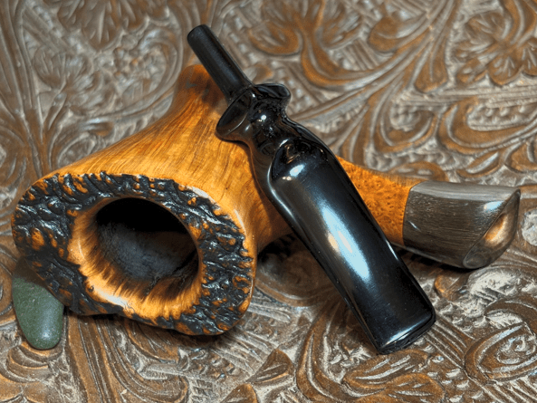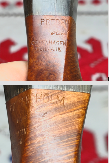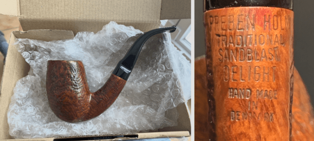 This striking Preben Holm Freehand has been waiting patiently for me to pay some attention to it since September 2019.  Most of the pipes I purchase go into the For “Pipe Dreamers” ONLY! collection to help financially support the Daughters of Bulgaria, now called Spring of Hope.  However, on this day in 2019, trolling on eBay, a beautiful Preben Holm popped up on the auction block.  You can imagine that there were many pipemen keeping an eye on that offering from a seller in Mendham, New Jersey.  In 2019 my wife and I were still living in Bulgaria, and if I! was able to land this Preben Holm for my own collection, it would be a while before we were introduced to each other.  Well, when the clock counted down the last bid was mine and the Freehand went to my daughter’s house in Colorado until we made the trek to the US.  I’m sad to say that this pipe and others that whispered to me to be added to my personal collection have been waiting longer than I expected.  For all you patient pipemen and women out there, the box on the right are the pipes in the ‘queue’ – that have been commissioned.  The box on the left are my neglected charges.  The Preben Holm Freehand is easy to spot!I decided that I would add the Preben Holm to my 2025 Christmas list.  Here are pictures of this Christmas pipe. The nomenclature is stamped on the shank underside separated by the curve in the design.  On the top is stamped, PREBEN HOLM [over in fancy cursive] Hand Cut.  The ‘Cut’ on the right side of the stamping (second photo) is very thin with the ‘Cu’ almost invisible.  Beneath this is stamped the COM: COPENHAGEN [over] DENMARK.This is the second Preben Holm I’ve added to my collection.  I came upon this Preben Holm Traditional Sandblast DELIGHT in March 2020 from a seller in Hamburg, Germany.  I was drawn to it because of its size and that it was a classic shape but still totally Preben Holm and unique.Preben Holm was responsible for the development of what became known as the ‘Danish Freehand movement’ where his commitment to quality was guided by the mantra, ‘Follow the grain!’.   This is the first introductory paragraph which describes the impact of Preben Holm on the pipe world (Holm, Preben – Pipedia):