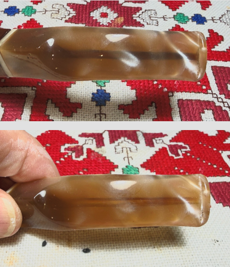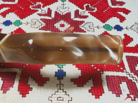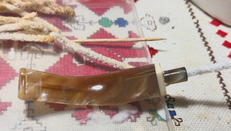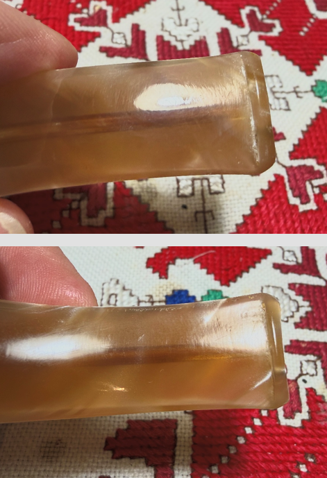 Turning back to the acrylic stem, I’m hoping to put a dent in the stained airway. This is always the bane of transparent acrylic stems – the airway stains. The cleaning starts first with pipe cleaners – bristled and smooth – moistened with isopropyl 99%.