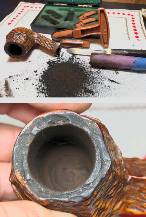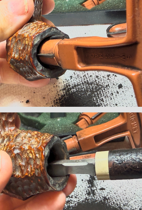 To begin, the chamber is reamed to clear away the carbon cake. Using the Pipnet Reaming Kit, 2 of the 4 available blades are used to ream the chamber. This is followed by scraping the chamber wall with the Savinelli Fitsall Tool which does great reaching down to the chamber floor to clean.