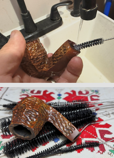 Next, the stummel is taken to the sink and using warm water, the internals are scrubbed using shank brushes and anti-oil liquid dishwashing soap. Dawn is my choice of soaps. After the scrubbing, the stummel is rinsed thoroughly and then taken back to the worktable.