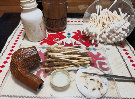 The next morning, more bristled and smooth pipe cleaners are employed using isopropyl 99% alcohol.
