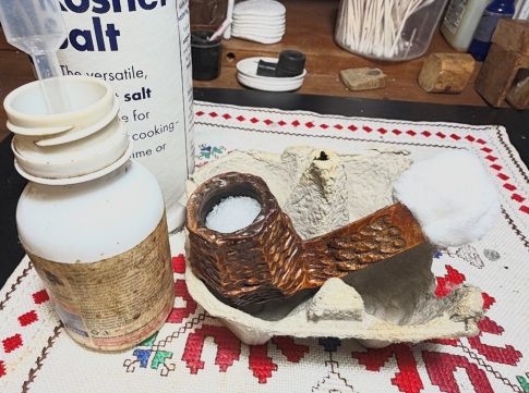 The stummel also soaked through the night with kosher salt and isopropyl 99% alcohol. The salt and wick show signs of soiling from drawing the oils from the internal briar.