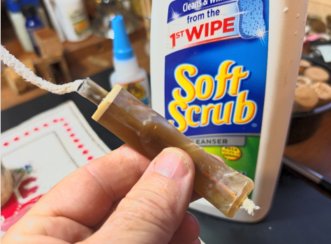 Not long after, the alcohol is exchanged for using Soft Scrub which has a bleach base. The scrubbing continues with Soft Scrub and pipe cleaners.
