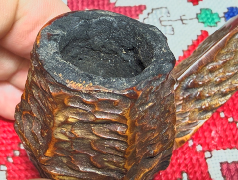 The acrylic stem also adds a nice contrast to the rough rustication with the slender white acrylic stem extension dividing the acrylic stem and stummel. Looking at the pipe itself, it is in solid condition with a need for basic cleaning. The chamber has a moderate build up of carbon cake. This will be removed to allow fresh briar to form a new protective cake and to inspect the condition of the chamber wall.