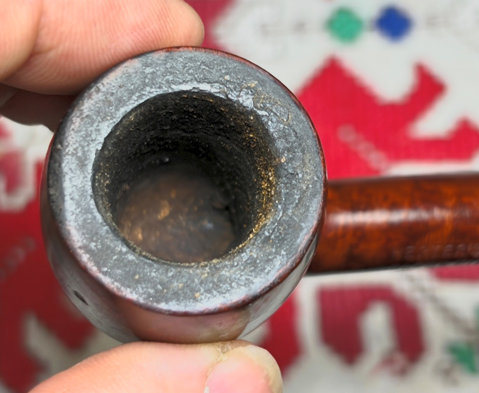 With the stem on the sideline, it’s time to take a closer look at the stummel after the general cleaning. There is no doubt that this rim has seen better days. If one sees ‘through’ the char stains you can see very nice looking grain that is begging to reemerge. The front of the bowl has more charring on the inside and outside edges of the rim.