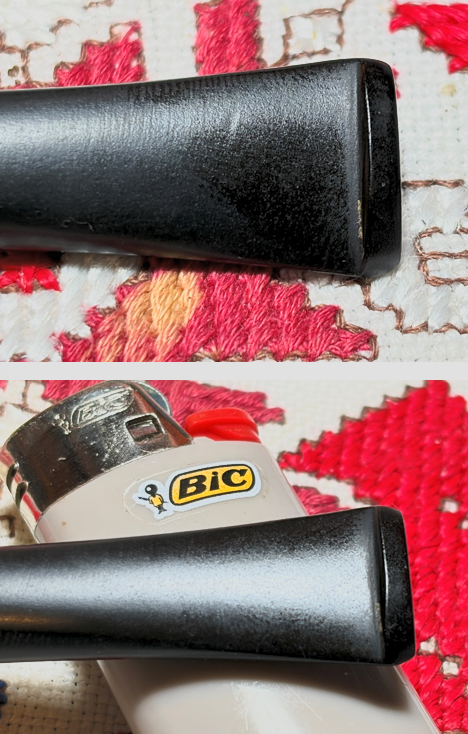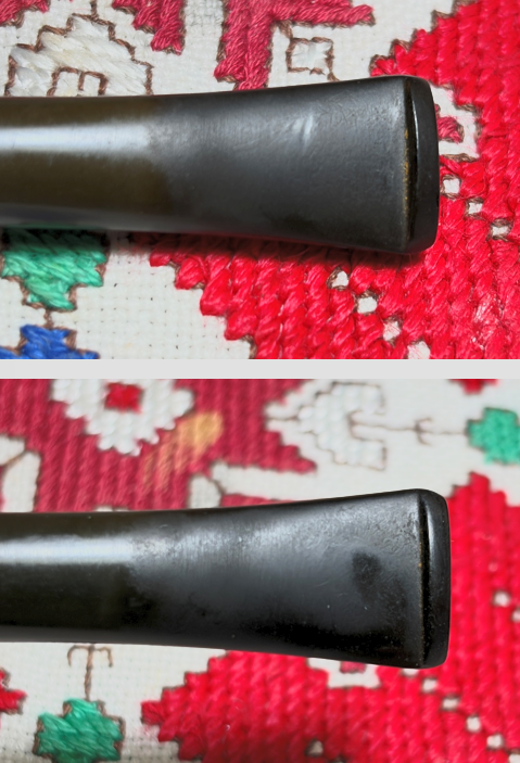 The stem is in very nice shape. The only bite compression I see is on the upper bit. The compression is very light. To erase the light compression the heating method is used. The flame of a Bic lighter paints the bit. As the vulcanite heats the rubber expands and regains its original condition – or closer to it. The before and after picture shows that the compression was totally removed.