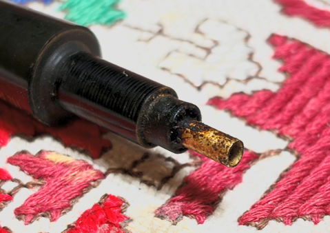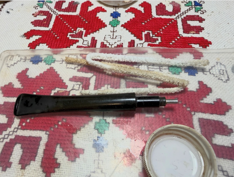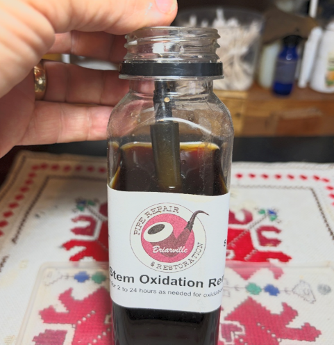 To address the oxidation, a pipe cleaner is threaded through the airway to act as a handle for easier retrieval. The stem is then placed in a soak with Briarville’s Pipe Stem Oxidation Remover for several hours.
