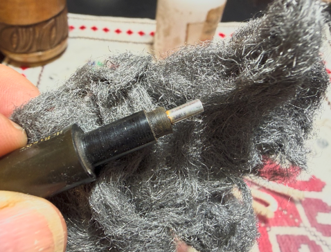 To remove the last vestiges of carbon cake, the chamber is sanded with 220 grit paper wrapped around a dowel rod.