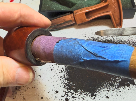 The next morning, the patches have cured and needle files go to work on the patch mounds bringing them down flush with the briar surface.
