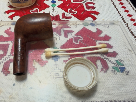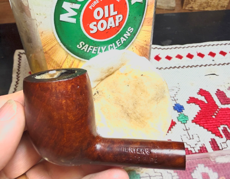 Next the external briar is scrubbed with undiluted Murphy Oil Soap and a cotton pad. It’s surprising how much dirt collects on the surface.