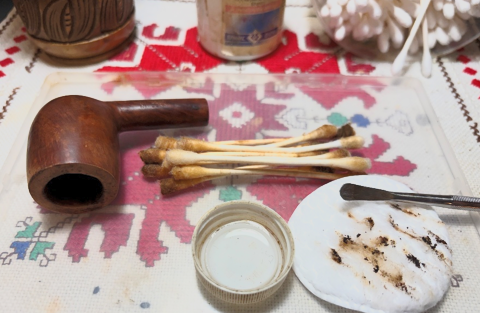 The pile of carbon removed is shown along with the tools used. After a quick inspection of the chamber, there is only healthy briar with no heating issues.