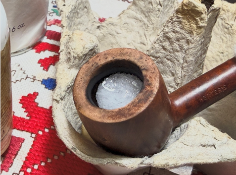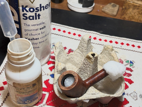 After about 10 minutes the alcohol has been absorbed into the salt and cotton and again is topped off. The stummel will soak for several hours through the night.
