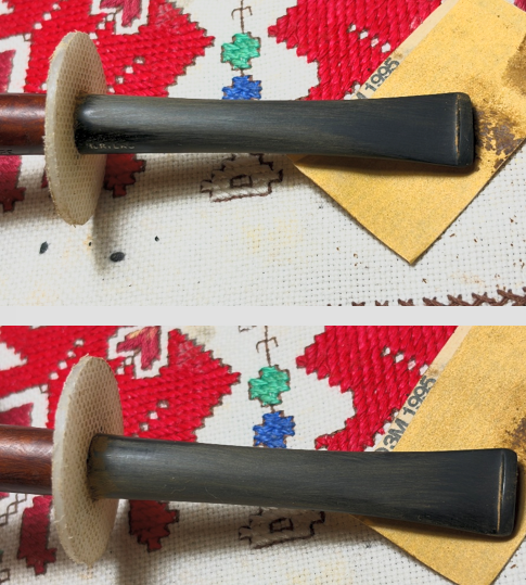 From the picture above, you can see that the vulcanite surface is rough. To smooth the vulcanite and to remove any imperfections on the upper bit, 320 grit paper sands the upper bit.