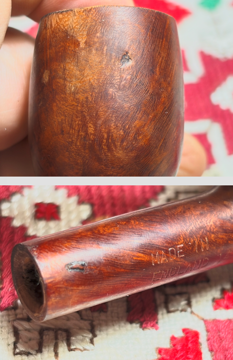 There are two old fills that need attention. The larger on the front of the bowl, and the lesser on the right back side of the shank.