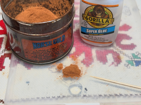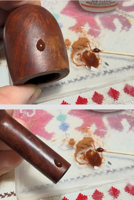 To repatch the pits, briar putty is used. After laying down strips of scotch tape on the plastic work palette for easier clean up later, a small pile of briar dust is placed near a dollop of regular clear CA glue. The patch areas are cleaned with alcohol. The toothpick is used to draw the briar dust into the glue and mixed. More dust is pulled into the mixture until the viscosity of the mixture is like molasses – thick enough so that it stays put when placed on the pit, but not so thick that the mixture solidifies too rapidly.