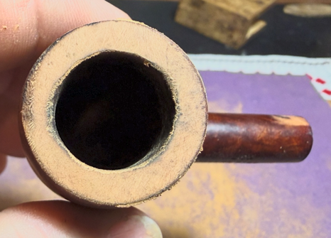 The cotton wick is then guided through the mortise and out the draft hole with the help of the stiff hanger wire. The cotton helps to draw out the tars and oils from the internal briar.