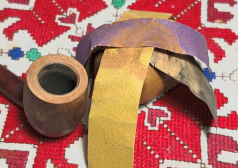 After the filing, 220 grit paper smooths the patch further. The challenge in doing patches on a stummel with a darker finish is the bald spot the sanding creates. Blending these patches so that they don’t stand out is the goal. I’ll complete the sanding process for the stummel before addressing the finish.