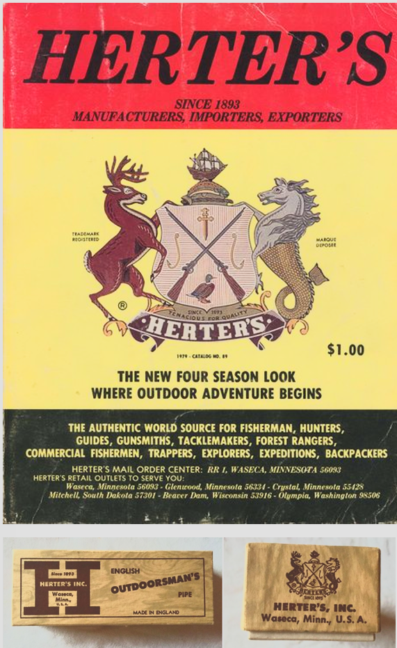 It didn’t take long to find some interesting information about Herter’s. Pipedia’s post (Herter’s – Pipedia) provided some pictures with this question as the only text: “Apparently this outdoor outfitting company had pipes made for them?” Our COM is England, but the outdoor store described was in the US. There was a picture of a pipe along with a catalog cover, a box belonging to an ‘English Outdoorsman Pipe’, and what appears to be a match box with the information that Herter’s, INC. started in 1895 and was based in the US: Waseca, Minnesota. I love period ads. The catalog cover is great with the Herter’s registered trademark which has inscribed beneath the coat of arms this motto: “Tenacious for Quality”.