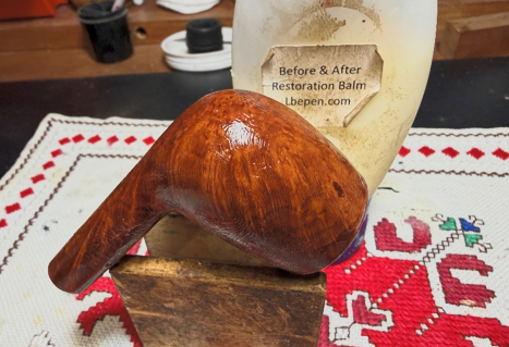 Mark Hoover’s ‘Before & After’ Restoration Balm (www.Lbepen.com) does a great job bringing out the natural hues of the briar and conditions it as well. After putting some Balm on the finger, the Balm is worked into the briar and then set aside for about 10 or so minutes for the Balm to do what it does.