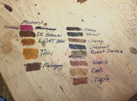 I looked at my rough palette of colors which is on the surface of the chopping board. The list on the right are the dye sticks I have available. I settled on the Maple dye stick and made a very small test application on the rim. It looked good.