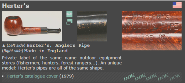 From Pipedia I swung over to Pipe Phil (He-Hh — Pipes : Logos & Markings) and found more information – some of which I questioned from the outset. The Apple shape shown in the panel below was also a Herter’s Anglers Pipe. Pipedia had the example of the “Outdoorsman” box and we have the “Angler”. Perhaps Herter’s had a pipe made for different hunting sports activities – that is cool! Or ‘Outdoorsman’ was a general name for the Angler Pipe in the box? The link provided for the catalog cover is referenced as being from 1979. The bit of information in the panel that I question is: “Herter’s pipes are all of the same shape.” We already know this is not correct as I look at the Herter’s Billiard on my worktable.